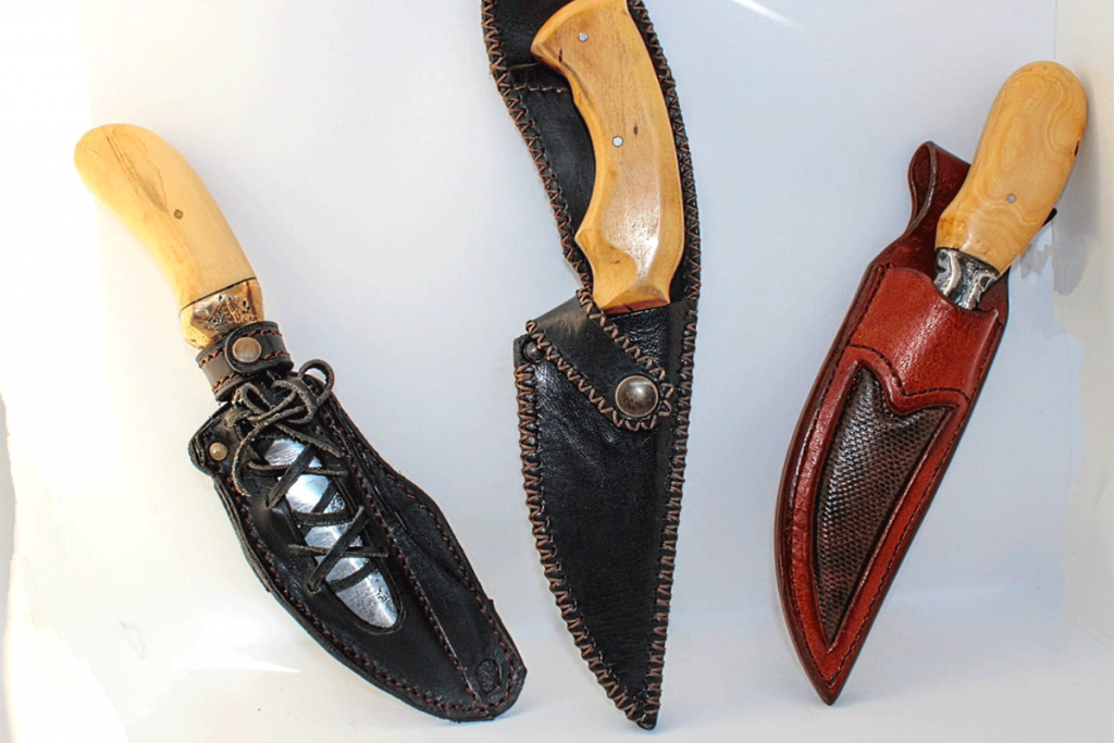 Chaque couteau est proposé dans un étui en cuir. Tous sont personnalisables sur demande. Montés et affûtés dans notre atelier, ces produits sont fabriqués à partir de produits locaux.